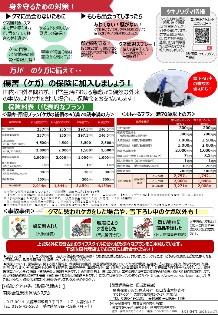 クマに合わないこと、ケガをしないことが一番大切ですが、万が一に備えた補償もございます。